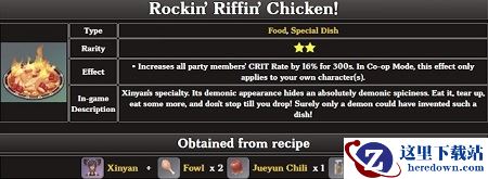 在游戏中,辛焱的特殊料理是摇滚鸡,该料理的基础版本为绝云辣椒鸡。