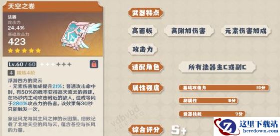天空之卷的初始基础攻击力为48,同样有着游戏中最高的基础攻击力面板,并且副属性满级能够提供33.1%的攻击力。这样的面板组合,提供的攻击力比起狼末阿莫斯之弓有过之而无不及。武器技能除了拥有高额的附加伤害外(精炼1为每30秒有960%倍率),还有着稳定的元素伤害加成(精炼1为12%)。