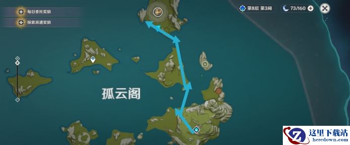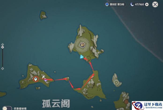 3、直接从秘境过去也行,这条路线不一定特别快,但是特别稳,左侧那个传送点的路线会在两边刷丘丘人,我这个路线不会,从岩本出发,跑到中间那个岛后贴着右侧跑,到达无相之岩所在岛屿后就是自行判断了。