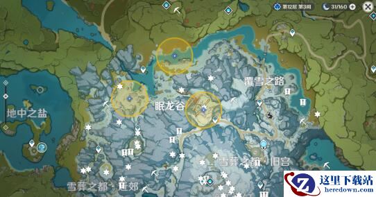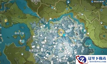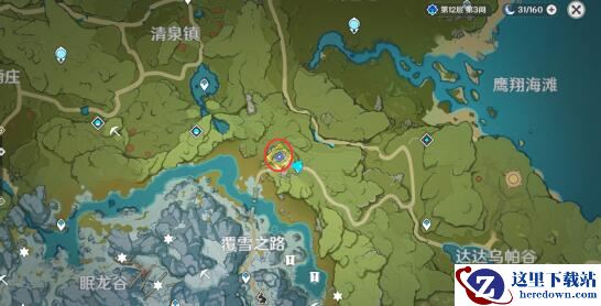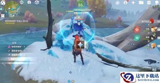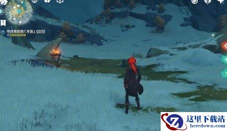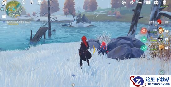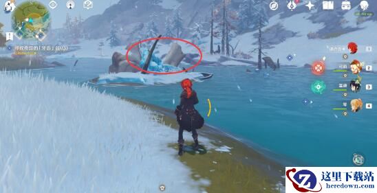 我们先找最上面的 从传送锚点直接沿着河岸走过去,在下图红圈处的远古坚冰下面就是我们要找的第一颗龙牙了。