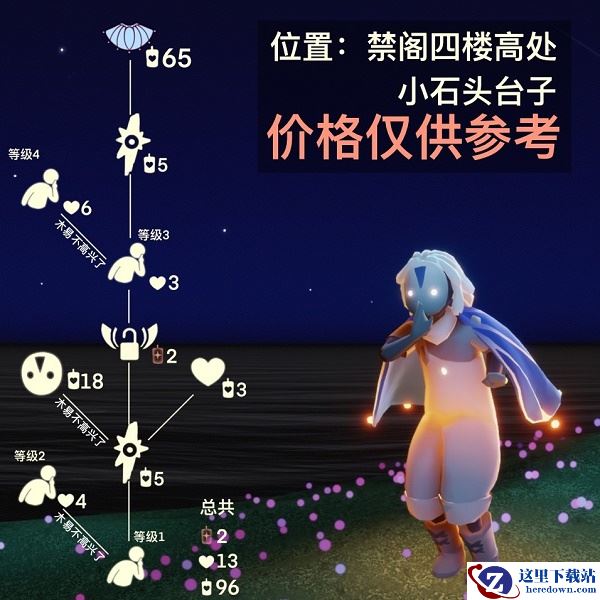 1、嘘声动作先祖兑换图如上图所示,大家可以很直观的看到额饰黑纹的三角额纹面具、荧黄微光缀边的幽蓝斗篷、以及嘘声提醒的噤声动作兑换所需的爱心和蜡烛数量,总共需要2根红蜡烛、13颗爱心、96根白蜡烛。