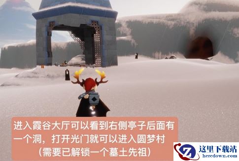 1、进入霞谷大厅可以看到右侧亭子后面有一个洞,打开光门就可以进入圆梦村(需要已解锁一个墓土先祖)