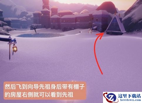 3、然后飞到向导先祖身后带有棚子的房屋右侧就可以看到先祖