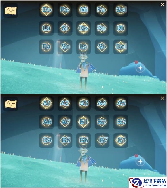 图上按键与游戏中的按键相对应,do、re、mi分别对应A1、A2、A3。