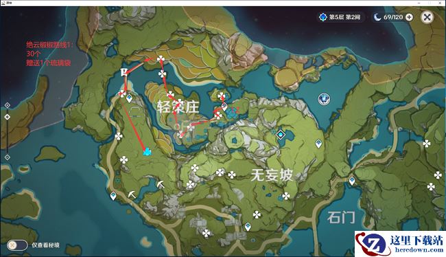 绝云椒椒在游戏中的任何地方都可以看到,首先我们可以来到轻策庄,这里的绝云椒椒分布还算密集,玩家能够在短时间内获得足够的绝云椒椒,具体的路线如下图所述,途中标记花朵的地方就是绝云椒椒的采摘地点。我们可以看到在轻策庄的周边都有着非常多的绝云椒椒。小编统计了一下,这里有着大概30个。