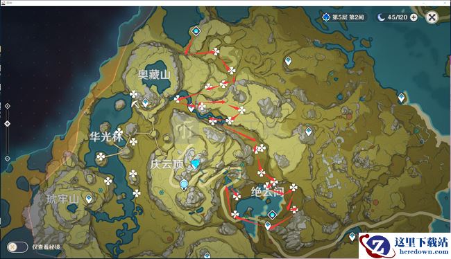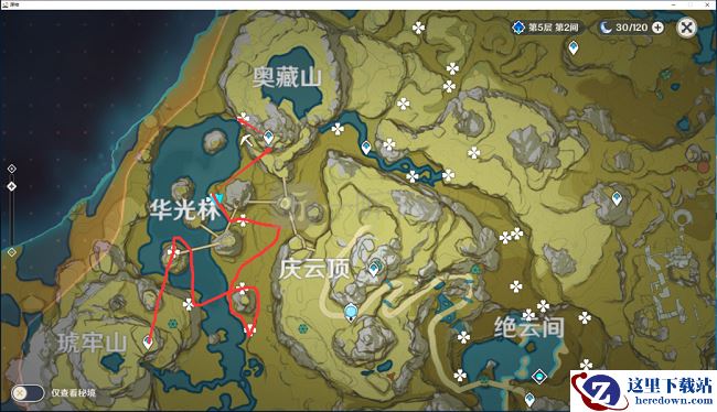 还有就是奥藏山的下方,这里的绝云椒椒虽然没有前面两个地方的多,也没有前两个地方的密集,但是我们也可以获得大概25个绝云椒椒,首先我们可以在下图中看到,在奥藏山西方的传送点有大概5个绝云椒椒,而且这里还有着矿产资源,玩家可以顺路收集,然后来到华光林右方的位置,在这里也有着10个左右的绝云椒椒,然后沿着途中红线的位置一直收集,能够收集到不少的绝云椒椒,当你收集完之后这些数量就够我们用一段时间了。