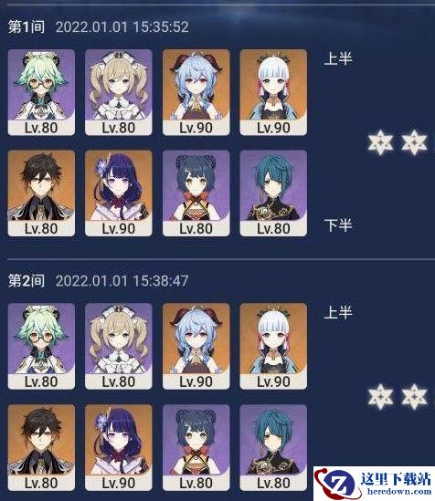两个队伍比较平民,不需要高命的支持,生存能力强,不是被秒杀都能苟住,辅助成本低廉,记住上半利用好甘雨E技能,让神里输出多AOE,那么满星就简单了,下半阵容输出很快,毕竟元素反应。