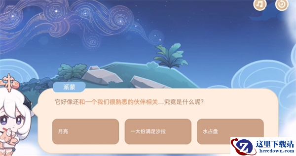 1:第一个问题是派蒙梦到在悬崖边上,有一个会发光的大大圆圆的东西,是什么呢?