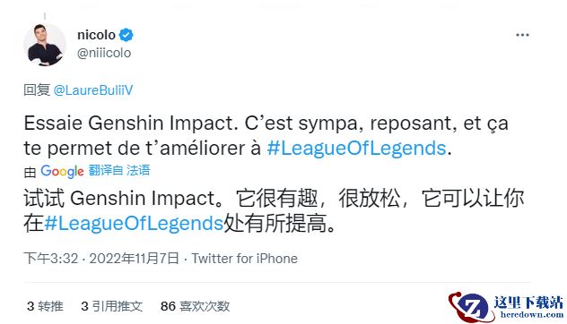 电竞赛事记者Laure Valée发文表示在下赛季开赛前不知道能够做些什么,而Nicolo Laurent在回复表示可以试试玩原神,称《原神》是个很有趣的游戏,还开玩笑的表示玩《原神》可以帮助玩家提高《英雄联盟》水平。
