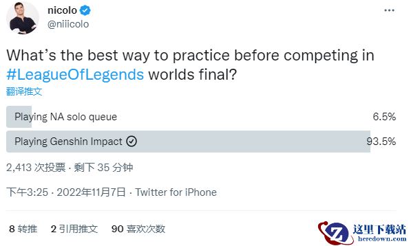 拳头CEO在说完这条帖子的内容后,又发了一个投票问:“进世界赛决赛之前大家最好的练习方式是什么?”93.5%的人投票给了玩原神