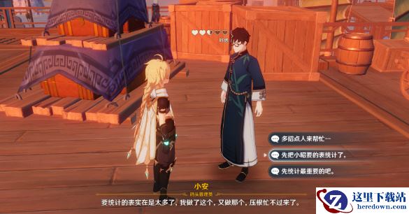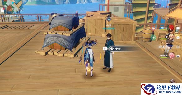 2、跟随任务指引,在璃月港码头卸货处与码头管理员小安对话,交付统计表;