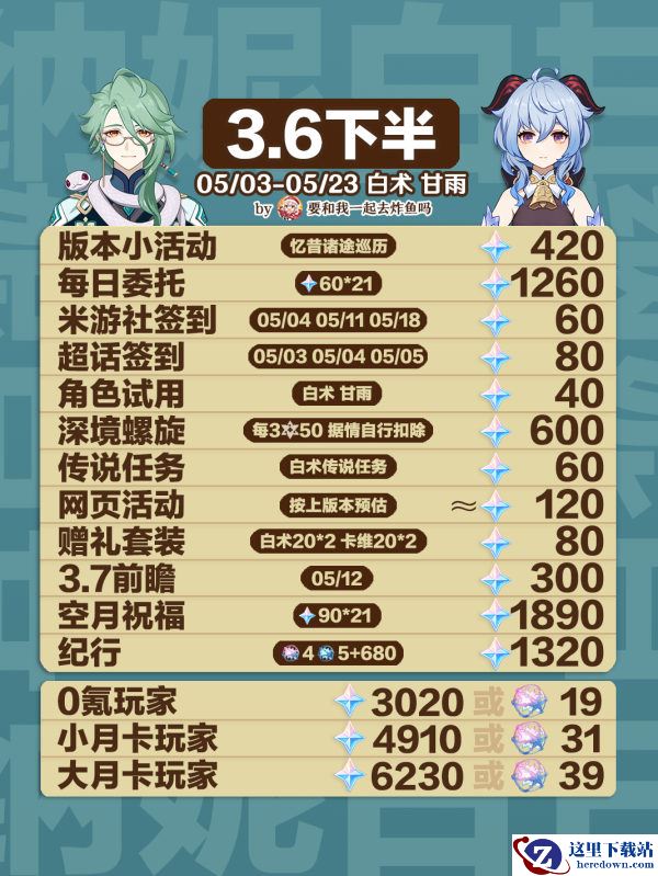 原神已经更新了3.6版本,相信有不少的小伙伴都下了卡池吧,不知道有没有抽中自己想要的呢,3.6下半将会在5月3号开启,直到23号,那这期间玩家一共可以获得多少原石呢,还不知道的小伙伴快来和小编一起看看吧。