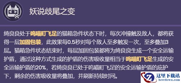 猫箱急件状态结束时,每层加固包装都将为绮良良生成一个安全运输护盾,通过这种方式生成的护盾的伤害吸收量相当于呜喵町飞足生成的安全运输护盾的20%,若绮良良已处于呜喵町飞足的安全运输护盾的庇护下,剩余的伤害吸收量将叠加,并刷新持续时间。