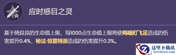 基于绮良良的生命值上限,每1000点生命值上限将使呜喵町飞足造成的伤害提升0.4%,秘法·惊喜特派造成的伤害提升0.3%。