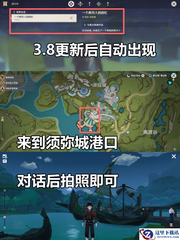 1.原神一个枫丹人的回忆任务流程非常简单,只需要来到须弥港口给npc拍张照就行,1分钟即可完成。