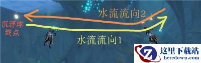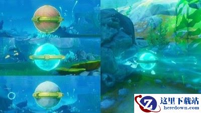 1.玩家来到解密处,先找异色螃蟹吸取护盾挡住高压水流,然后让水流中来回运动的沉浮球进入圆环装置。