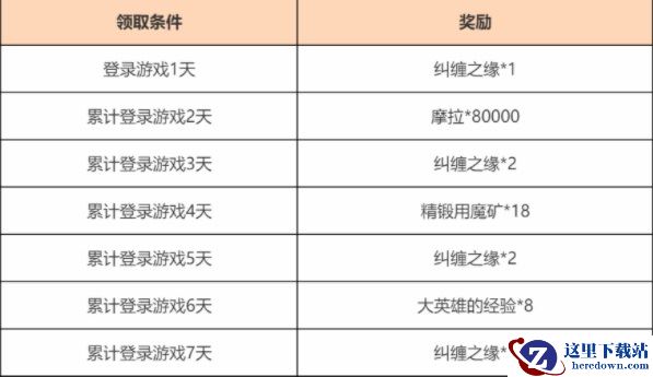 活动规则:在这个活动期间,玩家们只要累计登陆的七天就能够获得精锻用魔矿、大英雄的经验以及纠缠之缘等等的奖励;