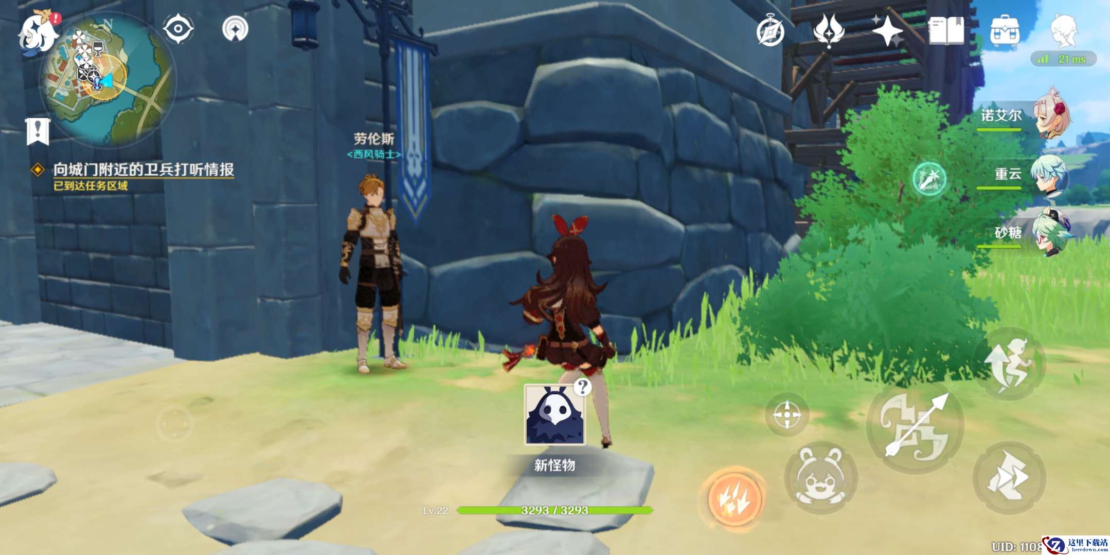 3、向城门附近的卫兵打听情报,去蒙德城的东边门找士兵对话,NPC叫劳伦斯。