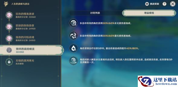 第四天的关卡怪物血量都相对较低,但有部分怪物有较高抗性,较为考验对群与聚怪能力,增益效果为对水元素、雷元素的角色存在增幅,且可强化受治疗角色的重击,较为推荐水/雷伤队、携带风辅与治疗位置、使用重击等类型的队伍。