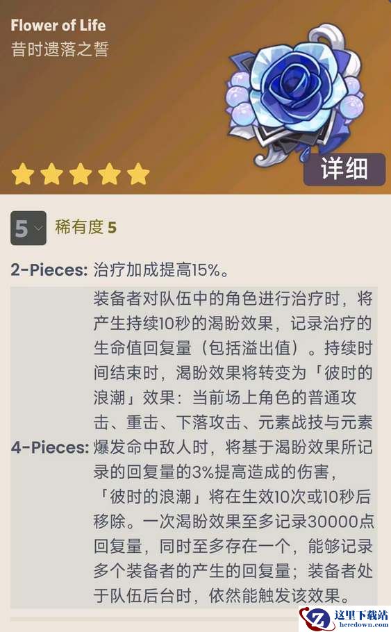 3件套:装备者对队伍中的角色进行治疗时,将产生持续10秒的渴盼效果,记录治疗的生命值回复量(包括溢出值)