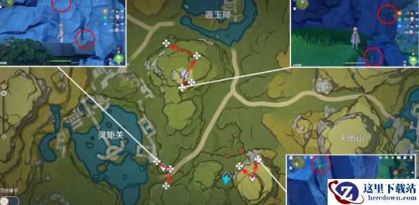 6、灵矩关,这里可以收集到十八个琉璃袋,离传送点近,并且点位集中,具体位置如图下。