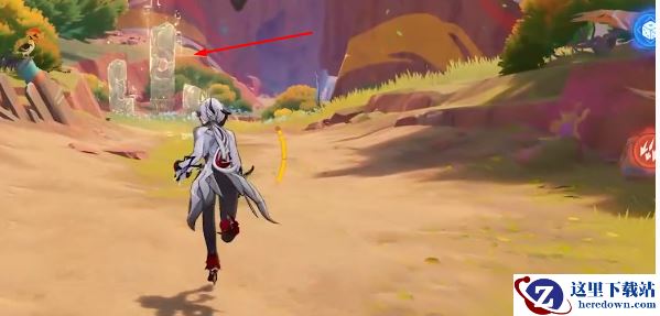 2、传送后,前往纳塔地区,向前方走,发现三根发光的石柱。
