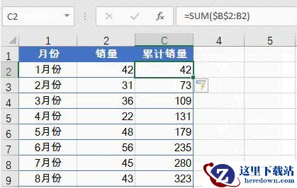 $B$2:B2部分,第一个B2使用了绝对引用,第二个B2使用了相对引用,在公式下拉时会依次变成$B$2:B3、$B$2:B4、$B$2:B5……这样逐步扩大的求和范围。最后得到的结果,就是从B2单元格开始,到公式所在行的B列这个范围之和。