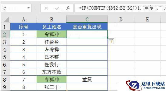 在$B$2:B8这个区域中,令狐冲出现了两次,也就是说B8是重复出现的。