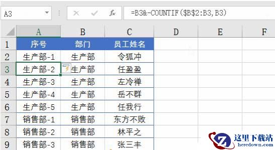 这个公式中,COUNTIF函数以$B$2:B2作为动态扩展的统计区域,计算B列的部门出现的次数。