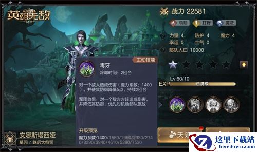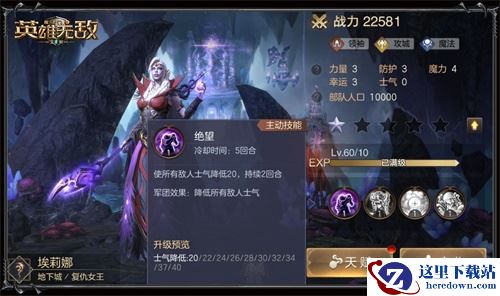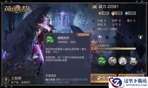 地下城英雄埃莉娜是许多领主的心头好,因为其降低士气的技能极大程度上可以降低敌方单位的作战能力,大地图上本就占有一定优势,而拥有军团技能后的埃莉娜又将这一优势进一步扩大,另一英雄兰勒斯防御效果本就突出,军团效果下可优先对敌方远程方阵造成伤害,补短板或是扩大优势,英雄实力提升都是显而易见。