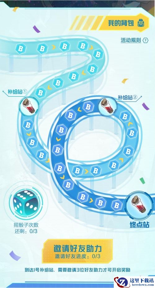 此次最先开启的过山车之旅活动,玩家需要通过摇骰子让过山车前进,而过山车每到达补给站或者终点站时可以领取特定的礼包来补充能量,当过山车经过1号补给站、2号补给站时,都需邀请3名好友助力,助力成功后方可开启对应站点奖励,同时过山车可继续前进,当过山车到达终点站时,也需邀请3名好友助力才能开启终点站奖励,不过轨道每个格子上都会有随机的“比特”奖励,这就要看各位玩家的手气如何啦!