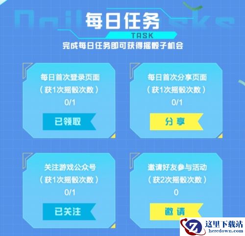 玩家可通过做每日任务的形式,获得摇骰子次数,例如每日首次登陆页面可获得1次摇骰子次数;每日首次分享页面可获得1次摇骰子次数;关注游戏公众号可获得1次摇骰子次数;邀请好友参与活动可获得2次摇骰子次数。所走路程越长,其获取的奖励也就越丰厚,与此同时,所有参与官网预约的玩家在《我的起源》不删档版本开启时,均可获得本次活动的相应奖励,届时请注意官网公告与游戏内发放通知。