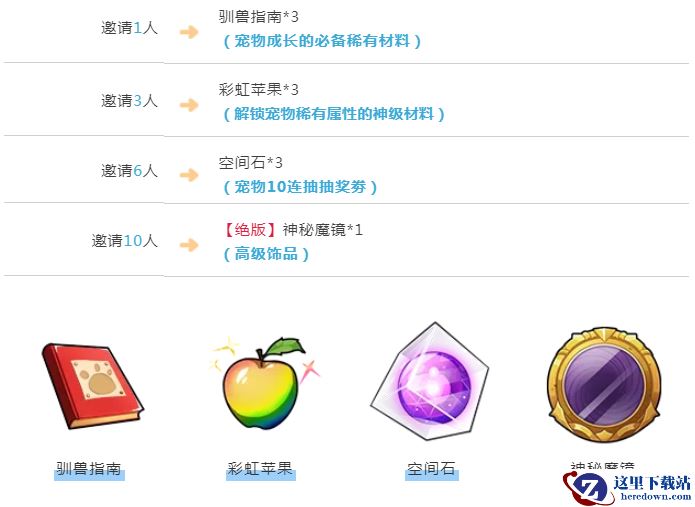 一个好汉三个帮,你获得的激活码越多,即可邀请更多好友,也能获得更好的奖励。游戏内获得激活码后,成功邀请好友进驻游戏,即可获得驯兽指南、彩虹苹果、空间石、绝版神秘魔镜等稀有道具。