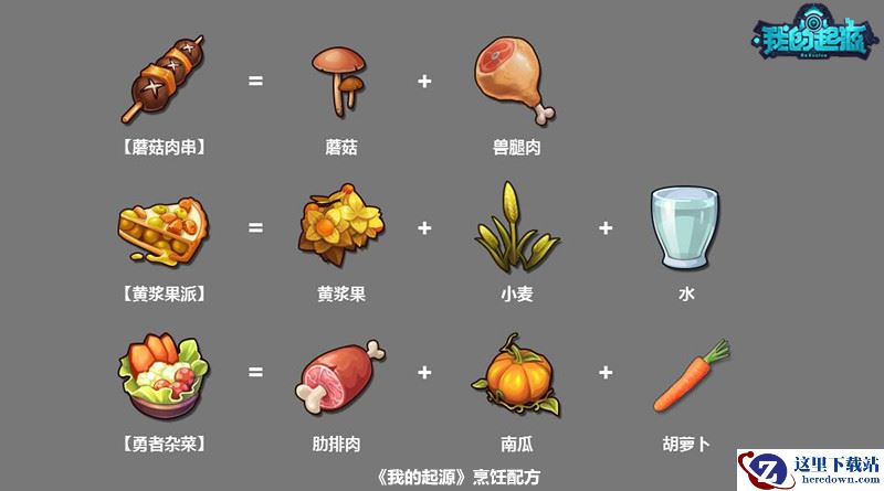 如果你讲究荤素搭配,可以用兽腿肉和蘑菇做一道【蘑菇肉串】,将鲜嫩的腿肉与蘑菇一起串烤,油脂与蘑菇完美结合在一起,吃完不仅口齿生香,还能在食用后增加探索者自身的攻击力。饭后再品尝一道由黄浆果、小麦和水做成的【黄浆果派】,松软的饼皮中间填满清甜的黄浆果酱,满满都是幸福的感觉!如果想换种口味,不妨试试备受欢迎的【勇者杂菜】,由肋排肉、南瓜、胡萝卜等新鲜蔬菜炒制而成,营养丰富。