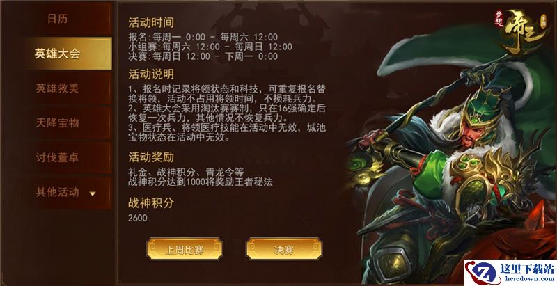 英雄大会每周分为报名、小组赛和决赛阶段。周一到周六上午12点前可以自由报名,随时替换自己最厉害的名将;周六中午12点开启小组赛,争夺16强名额;而周日中午12点的决赛,则是在16强中角逐出冠军。此外,在英雄大会中,武将所携带的医疗兵和治疗技能都是无效的,但战斗方面的属性和国学加成是保留的。