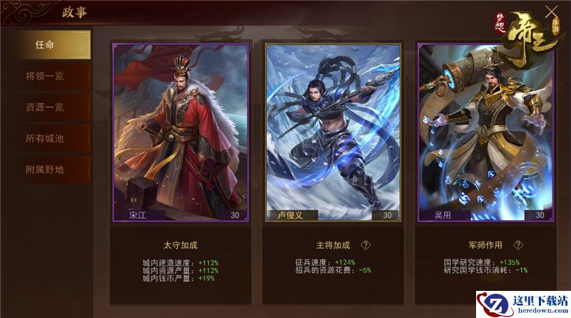 内政非常佛系,自由城建,想建哪建哪,建多少自己当家做主!内政这块自由度非常高,税收、民忠、军饷都可以自己自由调节。3个分城的设定可以让玩家针对性的选择城池的发展方向,可以作为卫城兴建军营、校场练兵充实军力,也可以建造大量民居发展经济。