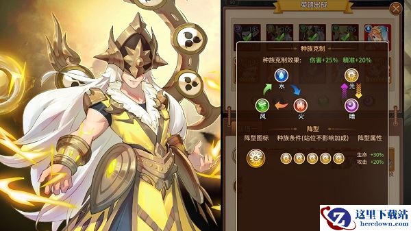 光系英雄得来不易,培养成本较之风火水三系会高些,所以一般以两色或五色阵容搭配出现。种族克制和阵型属性加成具体情况如下: