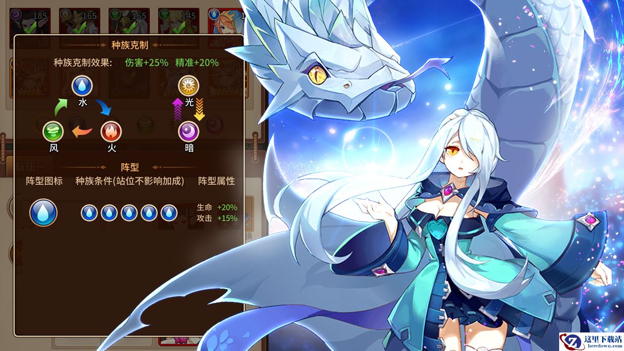 水系控场力很受青睐,辅助英雄也很强力,所以也时常出现在各色玩家阵营里。种族克制和阵型属性加成具体情况如下: