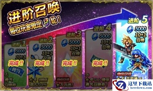 玩家们限定召唤3轮,每轮可召唤5次,每1次召唤玩家们都会获得指定的稀有奖励,五轮过后必将获得五星克劳德或艾尔弗里德其中一位。