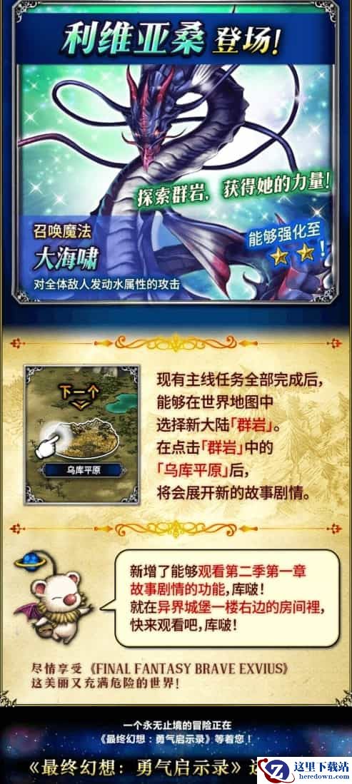 伴随着新剧情解锁的还有全新召唤兽利维亚桑,她具有独特的召唤魔法:大海啸,可以对敌人发动水属性攻击伤害。