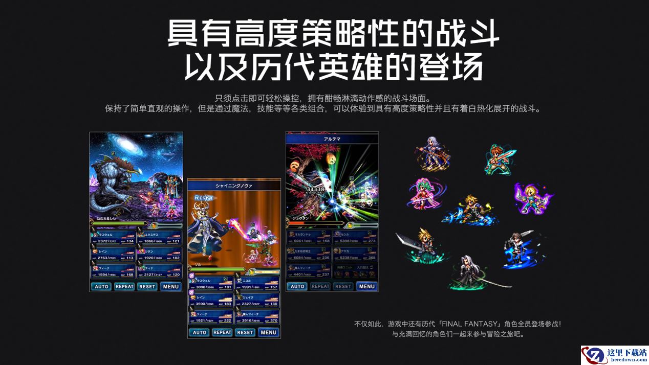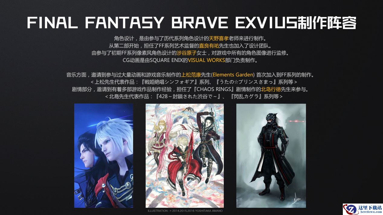 此外,FFBE 也是“最终幻想”系列诸多元老的大集结。参与了历代系列角色设计的天野喜孝老师来进行制作。从第二季开始,担任了FF系列艺术监督的直良有祐先生也加入了设计团队。由参与了初期FF像素风角色设计的涉谷原子女士,对游戏中所有的角色图像进行监修。CG动画是由一直引领着FF的CG发展的,SQUARE ENIX的VISUAL WORKS部门负责制作。音乐方面,邀请到参与过大量动画和游戏音乐制作的上松范康先生(Elements Garden),首次加入到FF系列的制作。剧情部分,邀请到有着多部游戏作品制作经验,担任了『CHAOS RINGS』剧情制作的北岛行德先生来参与。FFBE充分继承了FF系列的DNA,为玩家呈现出一部正统的日式RPG手游。