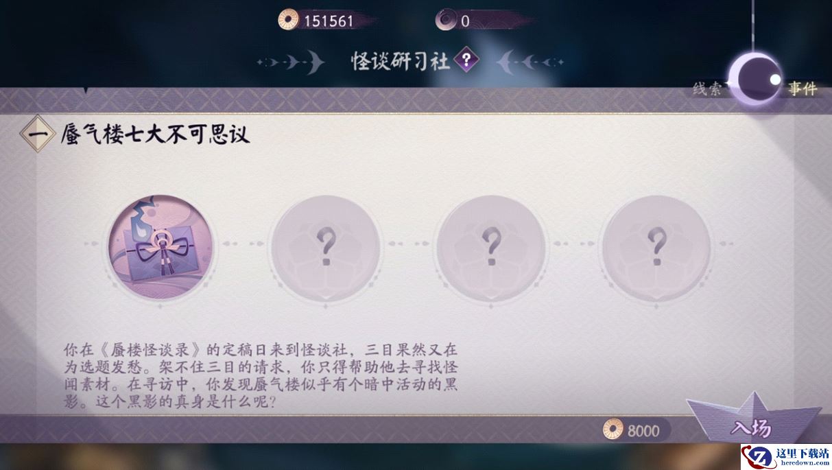 怪谈研习社的每册怪谈均为一个独立的剧情故事,由若干个章节组合而成。每次需要8000金币的入场费,也可以使用“怪闻墨玉”来开启。在进入怪谈冒险之后,将会遭遇不同的战斗或者事件,坚持得越久,就可以获得越高的奖励。