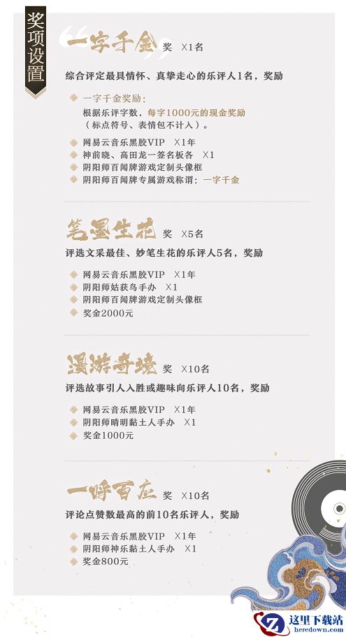 本次活动共评选出一字千金、笔墨生花、漫游奇境、一呼百应四个奖项。获奖者将获得高额现金奖励、阴阳师周边手办、网易云音乐黑胶VIP的丰厚大奖。其中,综合评定最具情怀、真挚走心的乐评人,将获得神前晓、高田龙一签名板,《阴阳师:百闻牌》定制头像框和专属称谓的特殊奖励。