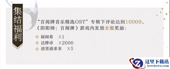 值得一提的是,参与“一字千金”活动的小伙伴们,不仅仅可以为自己争取到拿大奖的机会,还将助力全服玩家领取集结福利。当“百闻牌音乐精选OST”专辑下评论数达到10000时,《阴阳师:百闻牌》即在游戏内发放秘闻卷*1、达摩币*2000、进货请求书*5的全服奖励。