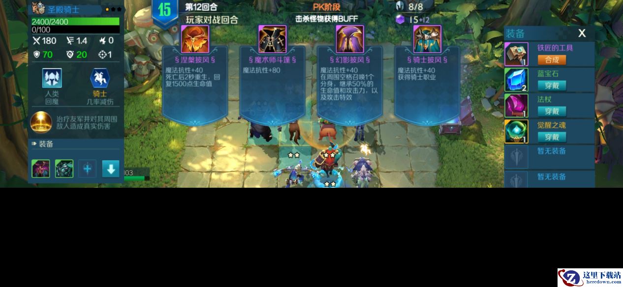 除了羁绊组合之外,在野怪回合里掉落的物品也会在很大程度上影响战局,棋子英雄戴上装备后会获得属性的提升,战歌的装备系统也做了一定的升级优化,轮抽选秀模式中的装备可以通过合成来升级,通过四选一来附加额外功能,所以抢装备很重要,所以设定上的排名靠后的玩家可以先选,给了他们翻盘的充分机会。