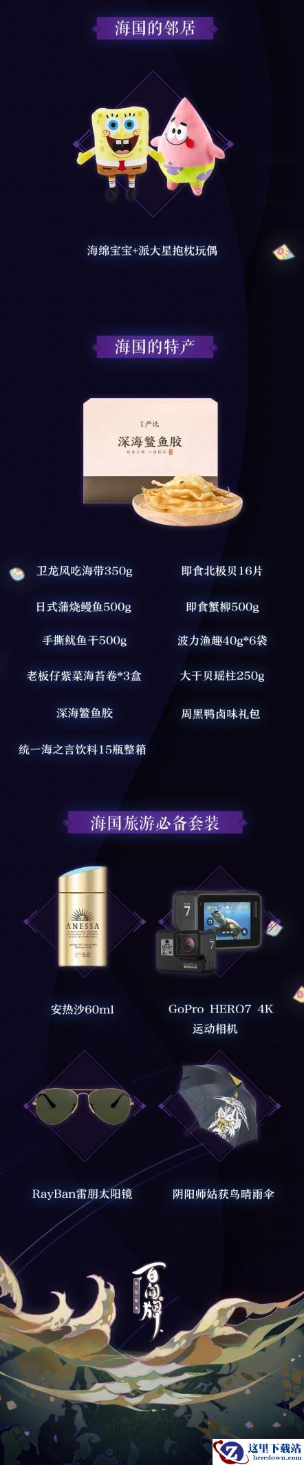 “海国锦鲤”可一人独享“520福利礼包”、“海国的邻居”、“海国的特产”与“海国旅游必备套装”四重福利。“520福利礼包”囊括《阴阳师:百闻牌》铃鹿御前全套卡牌,《决战!平安京》铃鹿御前式神,与《阴阳师》648高级符咒包。一次性畅玩三款游戏的铃鹿御前式神。