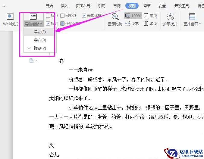 1、打开wps文档,然后点击导航栏上的“视图-靠左”。