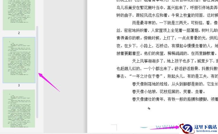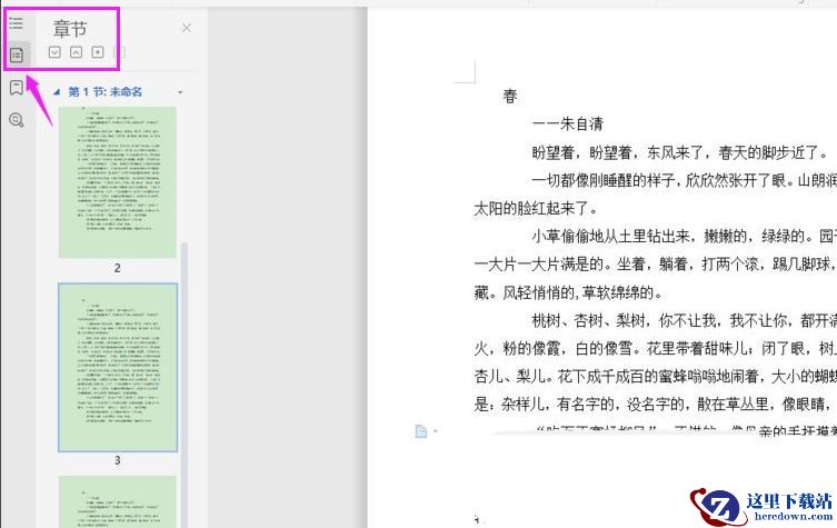 3、在左侧章节中,选择你将要删除的某页(如:第三页),这个时候文档就被定为到第三页。