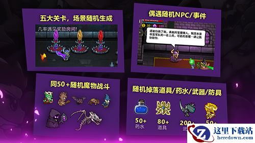 五大关卡,场景、怪物随机生成:每关都有属于自己的主要魔物,难度递进并且各自拥有独特的战斗策略,种类、数量完全随机!意想不到的NPC/事件,50+猜不透效果的药水,80+丰富战局的道具,200+技能各不相同的武器,50+属性各异的防具……每走进下一个房间,都将展开不同的冒险片段。
