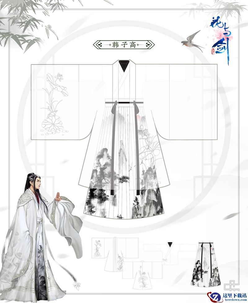 墨家领袖韩子高,胜雪白衣下有着沉稳内敛的气质。以纯白为底,工笔山水渐变至泼墨写意的图案,衬出几分出尘之意。